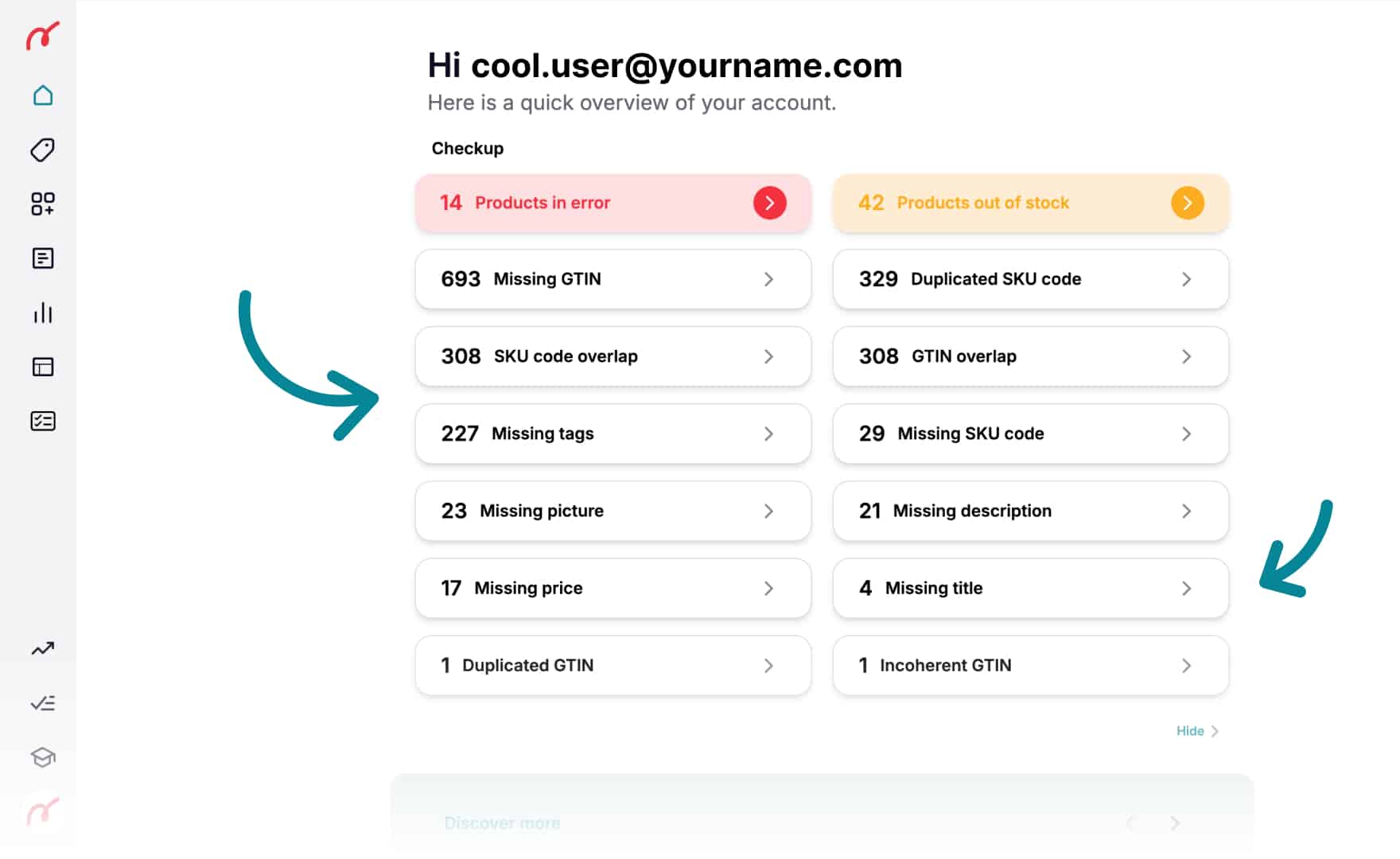 Nembol automatically scans your catalog and highlights various types of issues affecting product-data quality. It detects when a product is missing a SKU code or a GTIN, as well as when essential information such as title or description is not filled in. It also identifies missing values for quantity, price, tags, or pictures, ensuring that every listing is complete and ready for publishing.