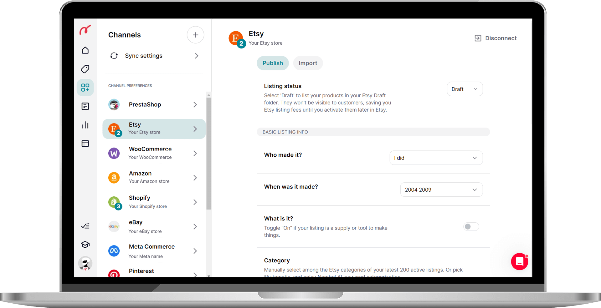 Prefer editing in Etsy? Switch ON the “Import updates” function and Nembol will import your changes from Etsy, then update listings automatically across all your connected channels.